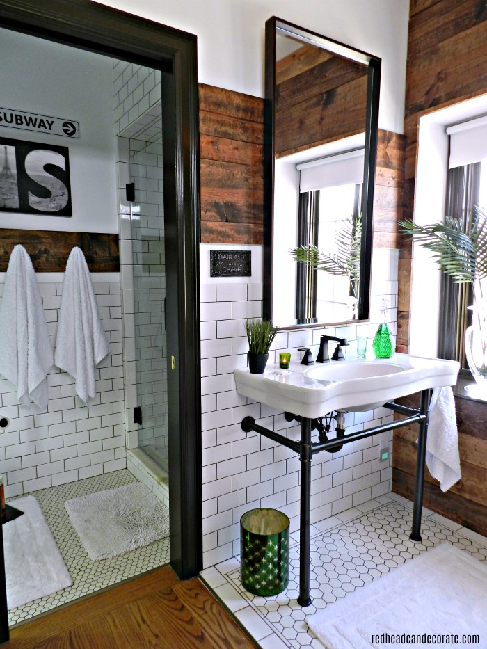 Rick get’s his handsome head shaved every week, so this iron shaving sign I found was a perfect fit. I love how the sterile white tile and warm wood mixes so well here. His entire station really gives off a rustic masculine vibe, with some soft spa-like touches with the green plants and candles. FYI-I posted more information about the wood in the “Tile Reveal” post. We carried the wood through the entire space, and have literally carried the rustic wood through out our home. It’s getting to the point where I can’t decorate without it. It just feels right.