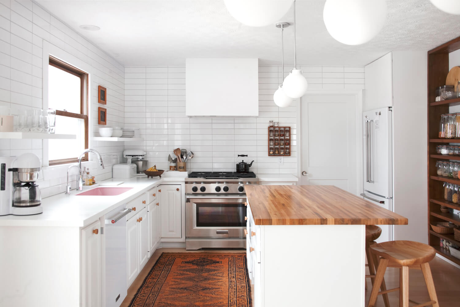 Wall paint: Benjamin Moore’s Super White Cabinet paint: Annie Sloan’s Pure White (not on hood vent or refrigerator cabinet) Wall tile: Home Depot Tile grout: TEC Silverado Outlets and switches: Legrand Radiant Pink sink: Thermocast Faucet: Kraus from Home Depot Island butcher block: Lumber Liquidators sealed with Flooring: Lumber Liquidators maple engineered wood Knobs: eBay Stove: KitchenAid from Home Depot Hood vent: Whirlpool from Home Depot with DIY cover Dishwasher: Refrigerator: KitchenAid from HomeDepot Coffee maker: Bar stools: Sold out at Target— similar here Dining chairs: LexMod Art: Milton Avery reproduction Round lidded baskets on shelving wall: Xinh & Co Kitchen radio: TEAC Lighting: Hinkley Congress collection Food storage jars: Le Parfait Bread boxes: Amazon – small and large Rug, spice rack, utensil crocks, dining table, booster seat, various pottery: vintage