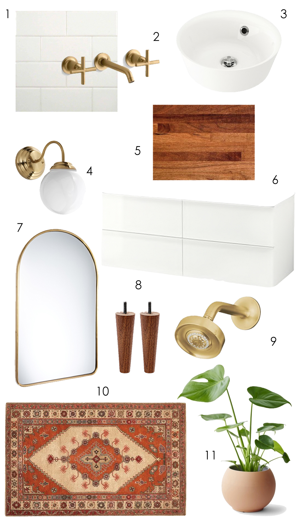 All that said, here are the official-ish plans! (Mirror and light fixtures are tentative…mulling over a few options). Swap the vanity + sinks, stain and seal the butcher block counter, add a subway tile backsplash to match the rest of the bathroom, change all black fixtures to brushed gold and finally, decorate with a vintage rug (my fave!) and lots of fresh greenery. Top it all off with a bubble bath, glass of cabernet and some candles burning. Let me lather on my facemask and ohhh girls I am READY.